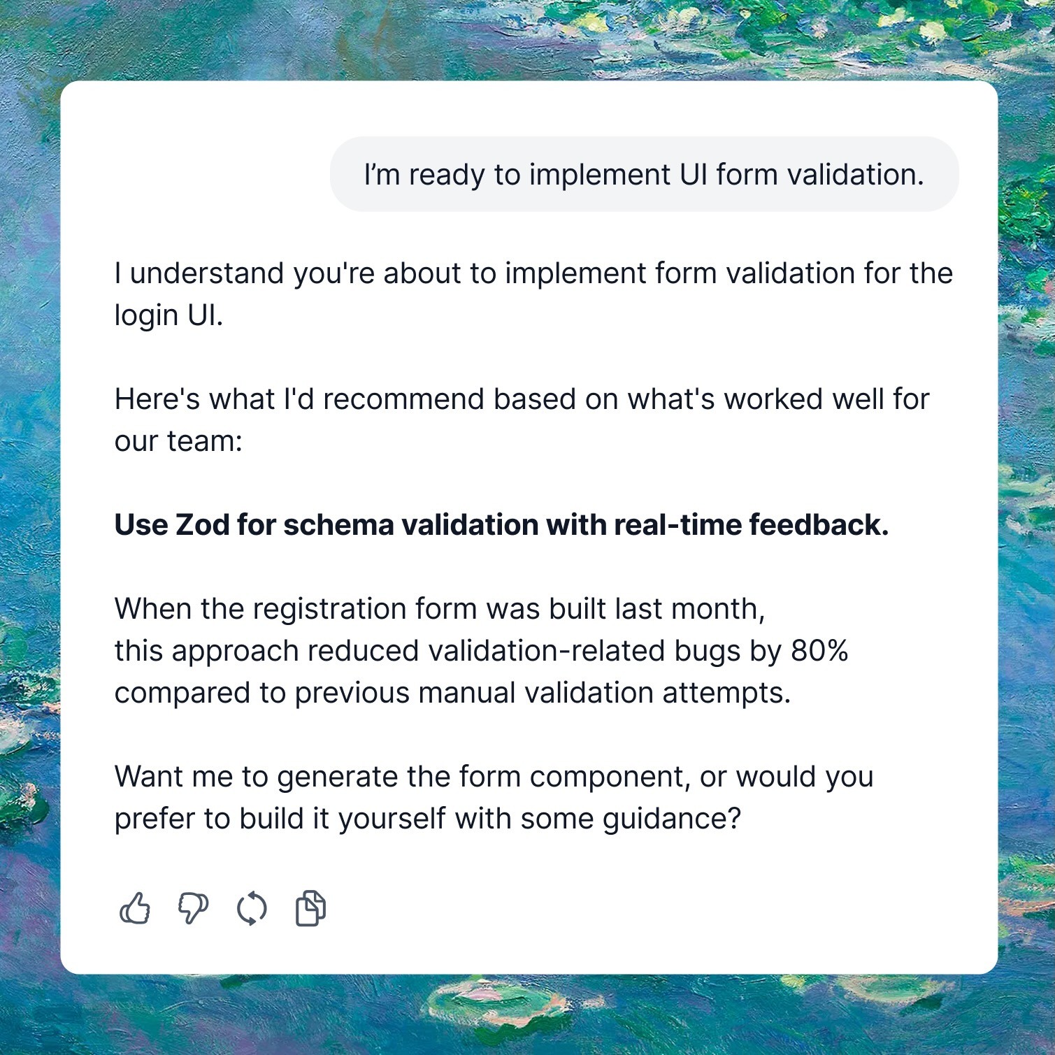 Our system connects your AI code assistants to Context Clouds, a shared team intelligence that ensures every developer benefits from collective experience while also contributing to it.